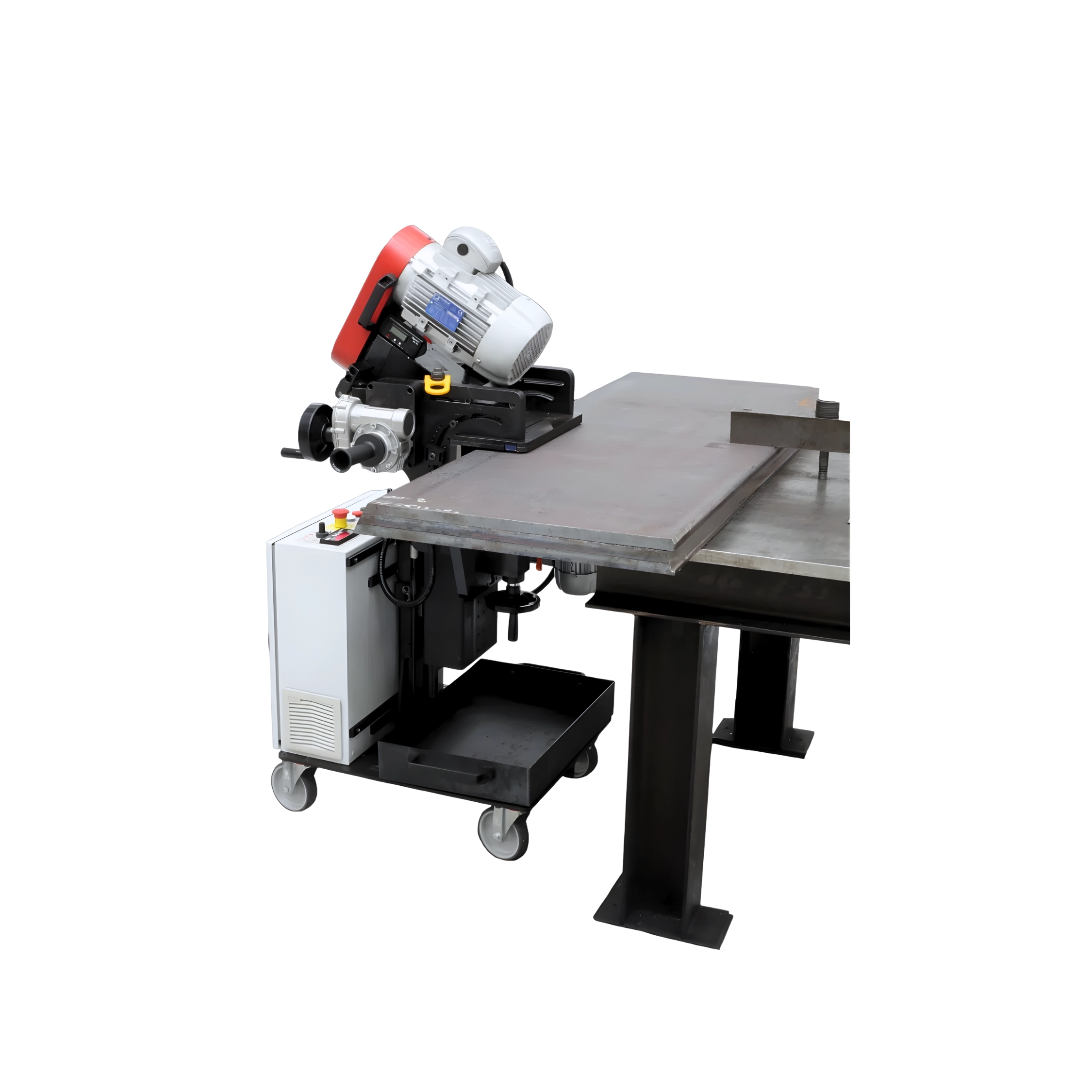 Maskinen är monterad på en självgående vagn som driver maskinen längs plåtkanten. Vagnen kompenserar samtidigt för ojämnheter i golvet, vilket bidrar till stabil och kontrollerad bearbetning även vid arbete med större plåtar. Den självgående funktionen gör att bearbetningen kan ske med jämn kvalitet och hög repeterbarhet i produktionen.